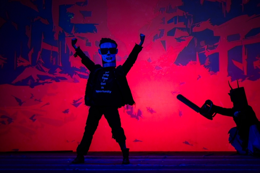 L’exercice du pouvoir à l’œuvre. Seul masque visage, blanc et reconnaissable, FaustX, guidé par Méphistophélès, s’impose au milieu de magnifiques masques reprenant les codes de divinités africaines et de percutants profils caricaturés des hommes au pouvoir en Afrique. Cette plastique, où le symbole, le rêve et le rite opèrent, sert les mécanismes coutumiers du dramaturge qui crée « des œuvres autour de la relation coloniale et post-coloniale entre l’Afrique, l’Europe, et plus largement, l’Occident. Les thèmes abordés dans mon travail concernent les dynamiques de ce paysage, l’exercice du pouvoir et ceux qu’il écrase ». Avec leur profil de marionnettes, les créatures performeuses maintiennent la distance nécessaire à l’esprit critique. Si le spectacle s’appuie sur le mythe faustien repris sous la plume d’un génie littéraire d’Occident, il guide la narration vers l’esprit contemporain, décrit les mécanismes actuels du pouvoir et ses ressorts anciens, non plus méprisés au nom de valeurs morales mais largement encouragés, qu’utilisent les hommes pour le posséder. Le texte de Goethe illustre parfaitement l’évolution vers la perte de sens et de l’idéal dans l’esprit de Faust quand il prend conscience qu’ils peuvent être futiles. À partir de là tout est possible, aucun argument raisonnable ne peut arrêter son ascension. Vraiment rien ?