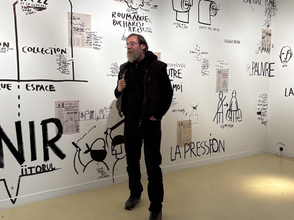 Au 22 rue Visconti, l’artiste Dan Perjovschi s’est emparé des murs blancs de la galerie éponyme pour écrire et dessiner à l’encre noire ses réflexions que lui inspirent Bucarest, l’Europe, le communisme, le socialisme, l’Europe, l’Eukraine, etc. Il a également collé plusieurs pages de l’hebdomadaire 22 (en référence à la chute du régime de Ceaucescu le 22 décembre 1989). Célèbre pour ses peintures et sculptures, comme pour ses provocations radicales traitées avec humour, Perjovschi a, depuis plusieurs années, choisi de s’exprimer en graffs sur les murs qui veulent bien d’offrir à lui. Avec cet artiste, né en 1964, on saisit la brutalité d’un passé qui n’est pas près d’être digéré, d’un espoir douché vers l’Europe et la dénonciation d’un présent et d’administrations dominées par l’inertie.