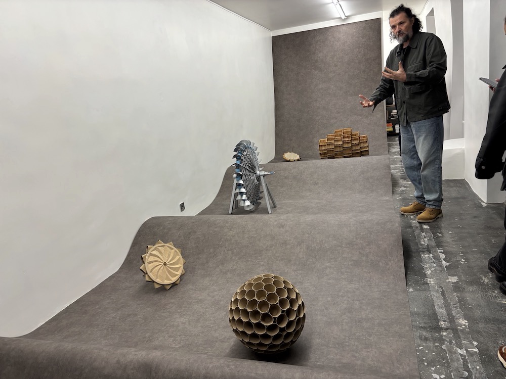 À deux pas, la galerie Boquet accueille l’installation de Dan Vezentan dont les œuvres sculptées sont réparties sur un long papier qui occupe tout le sol, tel un chemin dans la campagne roumaine. Une à une, ces œuvres vernaculaires racontent les traditions agricoles, font référence à un savoir-faire ingénieux, qu'il revisite pour rendre plus perceptible et admirable la relation passée avec la terre et l'eau conduisant à produire des formes simples et belles.