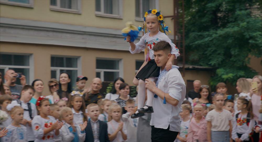 Si la réalisatrice ukrainienne montre la vie de tous les jours, avec ses rires, ses tensions familiales et professionnelles, ses moments forts comme la préparation de la cérémonie de fin d’année, elle n’a pas besoin de dramatiser la situation. Les photos des pères partis sur le front, les sirènes alertant de descendre aux abris, les drapeaux et les chants patriotiques, les périodes rares de découragement alternant avec celles nombreuses de résilience, le trouble des enfants ou le maniement des armes pour les plus âgés rappellent que le pays est en guerre et qu’à tout moment le pire peut tomber du ciel.