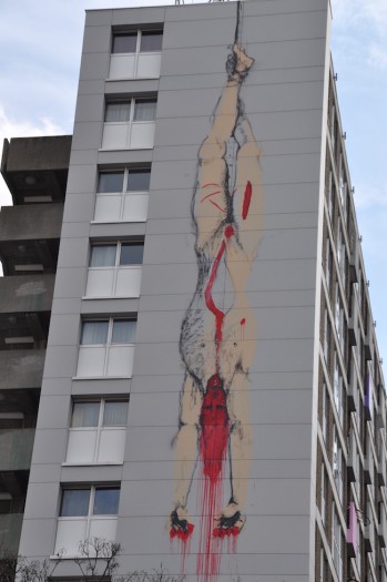 Violence politique. Le corps suspendu par les pieds, éventré, égorgé, reprend un détail d’un tableau du peintre hollandais Jan De Baen, intitulé Les corps des frères de Witt suspendus après leur lynchage. La scène représentée évoque un épisode de l’histoire hollandaise qui se situe à La Haye le 20 août 1672. Le bourgmestre de Dordrecht, Cornelis de Witt, réputé pour ses services rendus à la nation, se retrouve victime d’un complot organisé par les monarchistes du parti orangiste. Sur la base de fausses accusations de trahison, il est arrêté. Soumis à la torture, il refuse d'avouer et les juges le condamnent au bannissement. Mais il est lynché par une foule excitée, qui tue également son frère, à la tête du parti républicain, et libéré le jour même. Leurs cœurs et leurs corps horriblement mutilés sont exposés à la foule comme des trophées. Aujourd'hui, cet événement est considéré par les Néerlandais comme la période la plus honteuse de l'histoire des Pays-Bas. C’est donc l’un des deux corps que l’on retrouve sur la façade blanche d’un immeuble, exécutée sur sept étages, alors que la toile sombre de Jan De Baen ne mesure pas plus de 69,5 cm de haut. Cette dernière est conservée au RijksMuseum à Amsterdam.
